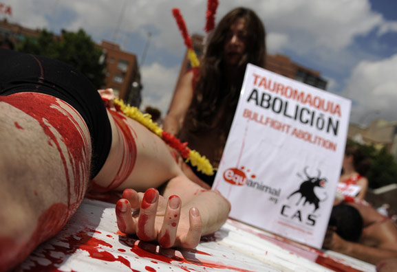 5月24日,西班牙马德里,大批环保人士聚集在凡塔斯斗牛场,他们赤裸上身,并涂上红色涂料,以此抗议斗牛的血腥行为。
