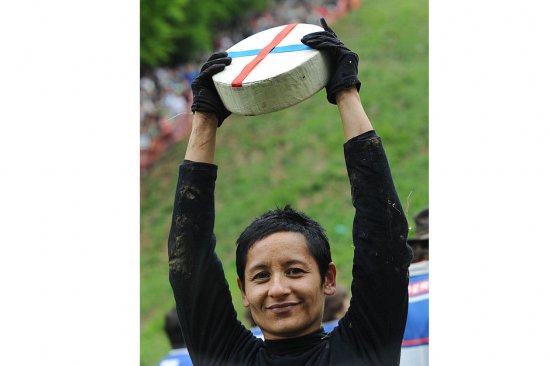5月26日,在英国格洛斯特郡库珀山举行的滚奶酪比赛上,参赛者奔跑追逐从山坡上滚下的巨型奶酪,最先追到者获胜。一年一度的滚奶酪比赛是英国格洛斯特郡的一项传统赛事,至今已有200多年历史,但由于山坡陡峭光滑,比赛中常有人受伤。