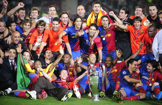 北京时间5月28日凌晨,第54届冠军杯决赛在罗马奥林匹克球场打响,最终巴塞罗那以2比0击败曼联,第3次夺得冠军杯,并成为冠军杯、西甲与国王杯“三冠王”。图为巴萨全队欢庆夺冠。