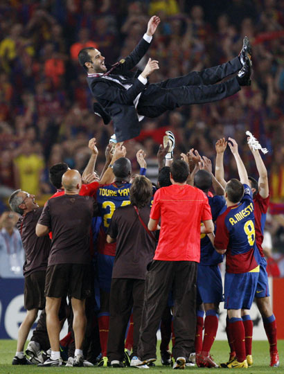 北京时间5月28日凌晨,第54届冠军杯决赛在罗马奥林匹克球场打响,最终巴塞罗那以2比0击败曼联,第3次夺得冠军杯,并成为冠军杯、西甲与国王杯“三冠王”。图为巴萨球员将主教练瓜迪奥拉高高抛到空中,欢庆本队夺冠。