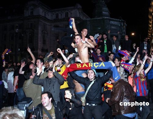 当地时间5月27日,巴萨球迷观看完在罗马举行的欧洲冠军杯决赛后,在伦敦皮卡迪利广场庆祝本队战胜曼联夺冠。中新社发 魏群 摄