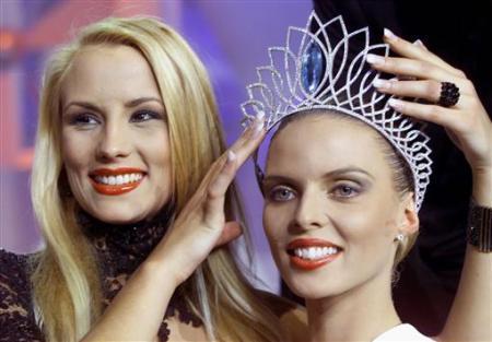 2001年度法国小姐Sylvie Tellier(右)与前任法国小姐Elodie Gossuin合影。