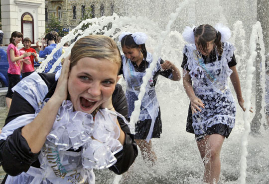29日,乌克兰基辅的学生在喷泉中玩耍,庆祝学期结束。这是乌克兰学校的一项庆祝活动,约有70万学生参与。