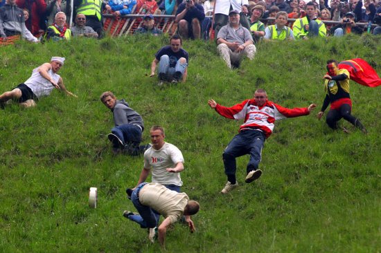 5月26日,在英国格洛斯特郡库珀山举行的滚奶酪比赛上,参赛者奔跑追逐从山坡上滚下的巨型奶酪。(图片来源:金鹰网)