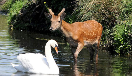 据英国媒体报道,英国30日的气温升至26度,不仅人们出去晒太阳,就连动物们也想去水里凉快下。一只年幼的小鹿在伦敦的Richmond公园里想小浸鹿蹄,不幸地是,该地盘内的主人天鹅却并不想和小鹿分享这一湖水,立刻对准小鹿的耳朵猛啄,用力捍卫自己的领土。尽管小鹿在体形上占据优势,但是小鹿最终还是不敌凶悍的天鹅,落慌而逃。
