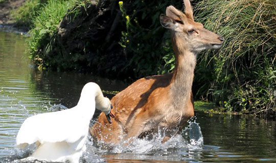 据英国媒体报道,英国30日的气温升至26度,不仅人们出去晒太阳,就连动物们也想去水里凉快下。一只年幼的小鹿在伦敦的Richmond公园里想小浸鹿蹄,不幸地是,该地盘内的主人天鹅却并不想和小鹿分享这一湖水,立刻对准小鹿的耳朵猛啄,用力捍卫自己的领土。尽管小鹿在体形上占据优势,但是小鹿最终还是不敌凶悍的天鹅,落慌而逃。