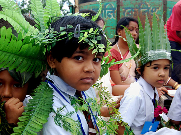 图为6月5日,印度学生将自己打扮起来,宣传世界环境日。