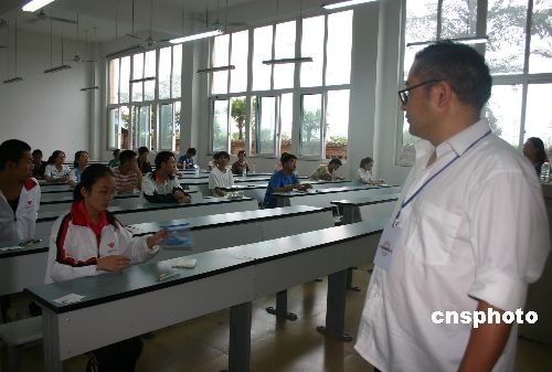 图为6月7日,四川地震灾区汶川县的1082名高三学生来到成都市内的考场,准备考试。中新社发 霍潺 摄