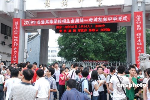 图为6月7日,广西桂林中学考点贴出横幅和对联,为考生打气鼓劲。中新社发 周利朔 摄