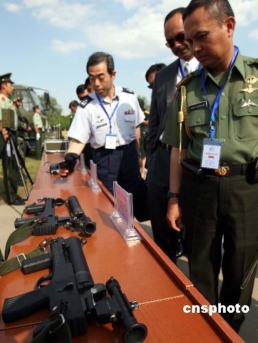驻河北武警某部6月9日下午接受参加首届东盟与中日韩(10+3)武装部队非传统安全论坛代表检阅,并演示训练成果。图为与会代表参观中国武警警用装备。中新社发 宋吉河 摄