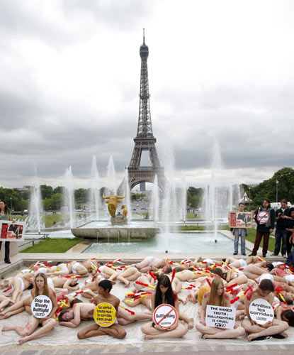 当地时间6月18日,法国巴黎,大批环保人士聚集在埃菲尔铁塔前,在赤裸的上身涂上红色涂料,以此抗议斗牛的血腥行为。