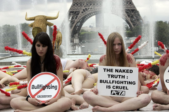 当地时间6月18日,法国巴黎,大批环保人士聚集在埃菲尔铁塔前,在赤裸的上身涂上红色涂料,以此抗议斗牛的血腥行为。