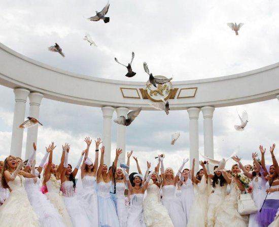 6月21日,在俄罗斯西伯利亚城市克拉诺亚尔斯克,已婚的女子重新穿上婚纱,参加一个名为“新娘游行”活动,重温结婚时的美妙瞬间。