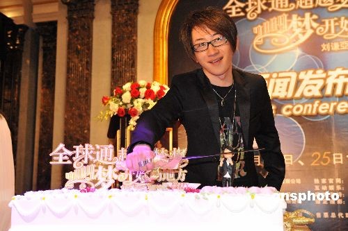 6月23日,“2009梦开始的地方”刘谦亚洲巡演北京站发布会在北京举行。发布会现场,粉丝团送上蛋糕,大唱生日歌,为刘谦提前庆祝6月25日的生日。中新社发 贾朔 摄
