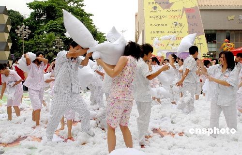 6月27日,“疯狂派对”之睡衣枕头大战在广西南宁精彩上演。