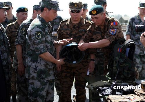 6月28日,中蒙“维和使命--2009”维和联合军事训练在北京地区某训练场举行开训仪式。这次联合训练按照联合国框架下维和分队担负的任务分理论研究、共同训练、综合演练三个阶段展开。图为双方部队领导参观双方单兵野战装备。中新社发 宋吉河 摄