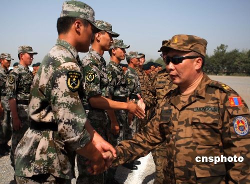 6月28日,中蒙“维和使命--2009”维和联合军事训练在北京地区某训练场举行开训仪式。这次联合训练按照联合国框架下维和分队担负的任务分理论研究、共同训练、综合演练三个阶段展开。综合演练阶段将以执行联合国框架下维和任务为背景,演练执行运输与警戒防卫任务,中方参训分队主要由北京军区某集团军所属部队组成。图为蒙古军方长官看望中蒙双方参训人员。中新社发 宋吉河 摄