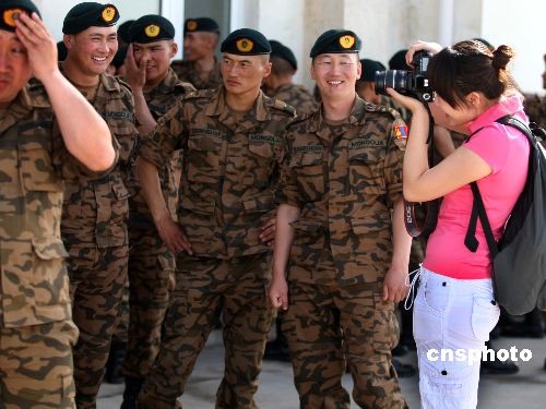 6月28日,中国蒙古“维和使命--2009”维和联合军事训练在北京地区某训练场拉开序幕。这次联合训练按照联合国框架下维和分队担负的任务分理论研究、共同训练、综合演练三个阶段展开。图为在解放军有关方面组织的记者采访中,中方一名女记者采访蒙古参训军人。中新社发 宋吉河 摄