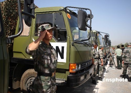 6月28日,中国蒙古“维和使命--2009”维和联合军事训练在北京地区某训练场拉开序幕,这次联合训练按照联合国框架下维和分队担负的任务分理论研究、共同训练、综合演练三个阶段展开。图为解放军展示参训运输装备。中新社发 宋吉河 摄