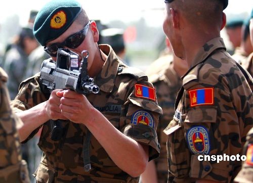 6月28日,北京持续高温天气,中国和蒙古“维和使命--2009”维和联合军事训练在北京地区某训练场举行开训仪式。这次联合训练按照联合国框架下维和分队担负的任务,分理论研究、共同训练、综合演练三个阶段展开。综合演练阶段将以执行联合国框架下维和任务为背景,演练执行运输与警戒防卫任务,中方参训分队主要由北京军区某集团军所属部队组成。中新社发 宋吉河 摄