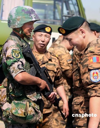 6月28日,北京持续高温天气,中国和蒙古“维和使命--2009”维和联合军事训练在北京地区某训练场举行开训仪式。这次联合训练按照联合国框架下维和分队担负的任务,分理论研究、共同训练、综合演练三个阶段展开。综合演练阶段将以执行联合国框架下维和任务为背景,演练执行运输与警戒防卫任务,中方参训分队主要由北京军区某集团军所属部队组成。中新社发 宋吉河 摄