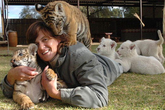 据英国媒体27日报道,南非一位名为Riana Van Nieuwenhuizen的妇女十分喜欢抚养猛兽。现在,Riana一共抚养了包括4头豹子、3头小白狮、2头小狮子和2头小老虎。它们都是被自己的父母遗弃后被周边的动物园送到她这里来的, Riana堪称这些猛兽的“亲妈妈”。