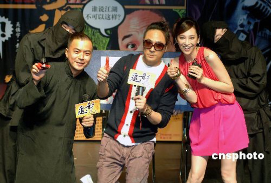 6月30日,吴镇宇执导的喜剧武侠电影《追影》海报及主题曲发布会于北京举行。吴镇宇携美腿吴佩慈现身发布会现场。吴镇宇大展惊人恶搞才能,惹吴佩慈笑得花枝乱颤。《追影》海报上的一句“我要”被吴佩慈反复演绎,其“史上最嗲”的颤音令吴镇宇和党淏瀚都抵挡不住。中新社发 李学仕 摄