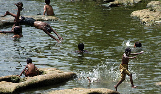 巴基斯坦伊斯兰堡,一些年轻人跳入河中纳凉,而另一些人却躺在树荫下纳凉。