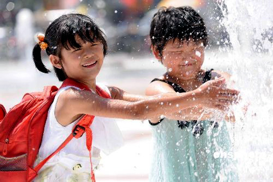 河南郑州室外气温超过摄氏40度,人们在二七广场喷泉嬉戏纳凉。中新社发 刘书亭 摄
