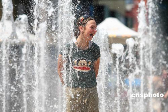 一位少年在北京三里屯附近一商店的音乐喷泉中戏水避暑。中新社发 富田 摄