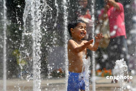 外国小朋友在北京三里屯附近的音乐喷泉中戏水避暑。中新社发 富田 摄