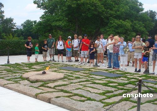 七月四日是美国独立日,数以万计的美国人前往美国最大和最著名的国家军人公墓——阿灵顿国家公墓,悼念为国捐躯的烈士们。图为游客正在美国前总统肯尼迪墓地前悼念,该墓地的长明火已经燃烧了四十多年。中新社发 吴庆才 摄