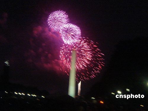 七月四日晚,为庆祝美国独立日,美国首都华盛顿举行烟火燃放表演。图为当晚华盛顿中心区著名的方尖塔上空被绚丽的烟花照亮。中新社发 吴庆才 摄