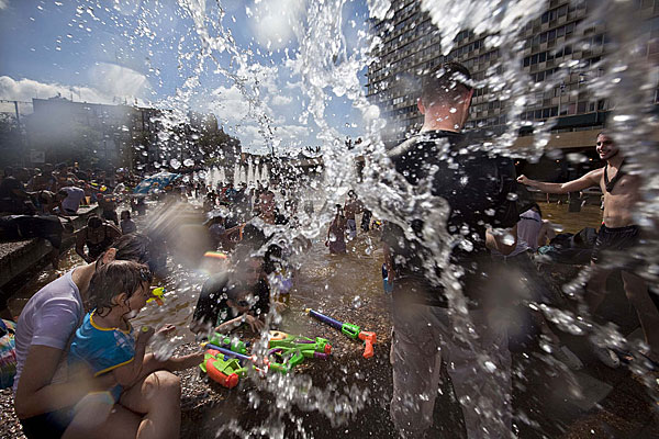 7月1日,以色列特拉维夫人们在拉宾广场参加一年一度的打水仗活动。