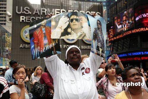 美国当地时间七月七日下午的纽约时代广场,多个大屏幕电视都在直播在洛杉矶斯台普斯中心举行的迈克尔.杰克逊公众追悼会,引来许多路人观望驻足。中新社发 孙宇挺 摄
