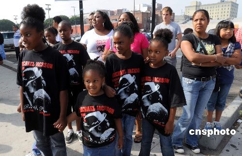 七月七日上午,迈克尔·杰克逊的公众悼念活动在洛杉矶斯坦普斯体育中心举行。预期场外可能出现的数十万歌迷自发悼念的情形没有出现,在体育中心周边只有数百人聚集。图为一群身穿迈克尔纪念T恤的非裔儿童在场外等候。中新社发 张炜 摄