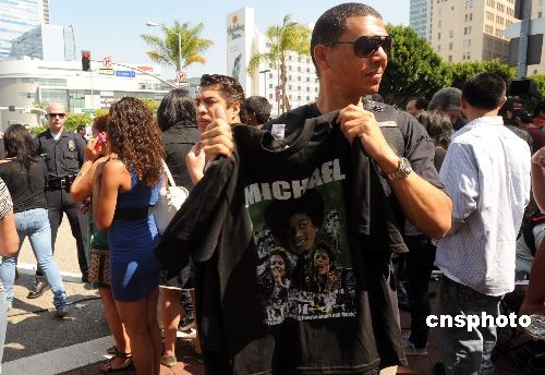 七月七日上午,迈克尔·杰克逊的公众悼念活动在洛杉矶斯坦普斯体育中心举行。预期场外可能出现的数十万歌迷自发悼念的情形没有出现,在体育中心附近的匹克大道与南花街交界处聚集人群最多,也只有数百人。原本想大赚一笔的小贩大失所望,纷纷降价甩货。图为小贩兜售迈克尔纪念T恤,乏人问津。中新社发 张炜 摄