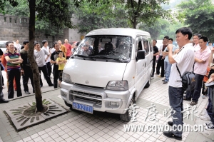 36岁的重庆红旗印刷厂司机罗志勇用时4分11秒将一辆长3.84米的面包车,停入两棵相距3.9米的行道树。(图片来源:重庆晚报)