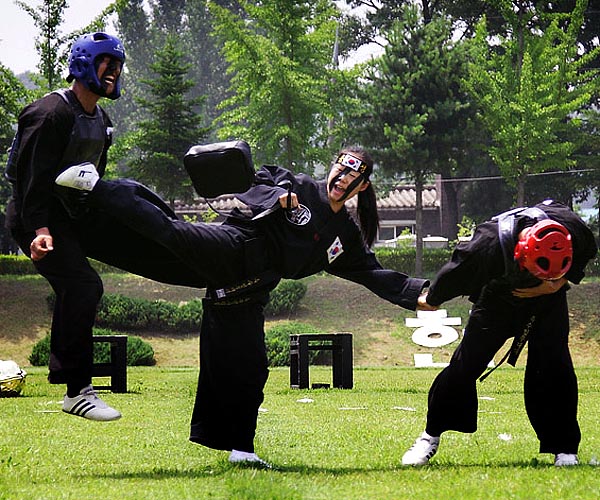 7月8日,韩国特种部队出动男女特种兵进行了跆拳道格斗术演练及特技表演。近日,朝核危机以来韩国三军部队频频进行军演。