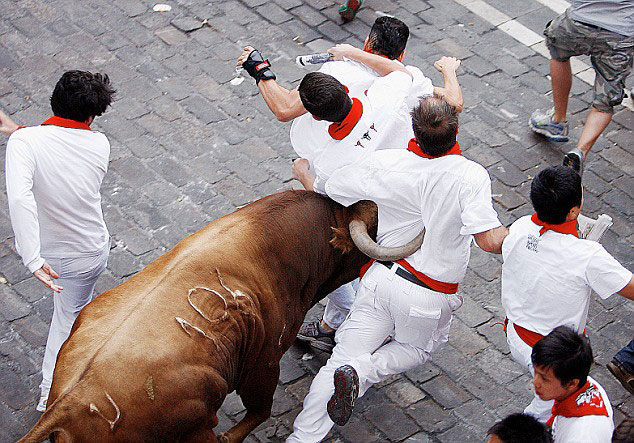 据英国媒体报道, 在西班牙邦布罗纳地区举行的奔牛节10日传出噩耗,27岁西班牙青年罗梅洛被牛角刺伤颈部及肺部不治,另有9人受伤,其中3人遭牛角戳伤,6人于奔牛过程受轻伤,这是近14年来奔牛节活动首次有人死亡。 图为一头公牛正在冲向人群。
