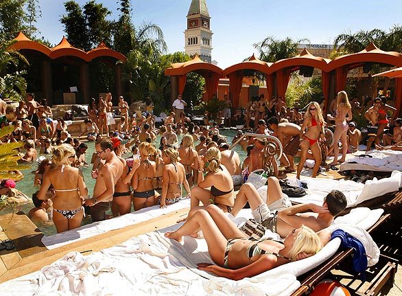 在美国赌城拉斯维加斯的威尼斯人赌场饭店,有一个独一无二的露天泳池,它没有幽静的花园,也没有海豚表演,在这里只允许成人入内,在泳池入口,有工作人员负责检查每个人的身份证,以防止未成年人进入。这里每个周末都会举行狂欢Party。