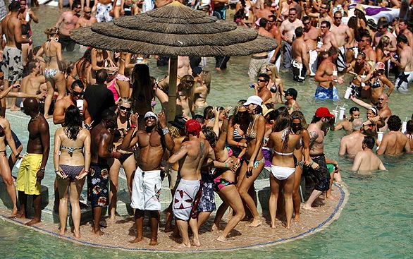 在美国赌城拉斯维加斯的威尼斯人赌场饭店,有一个独一无二的露天泳池,它没有幽静的花园,也没有海豚表演,在这里只允许成人入内,在泳池入口,有工作人员负责检查每个人的身份证,以防止未成年人进入。这里每个周末都会举行狂欢Party。