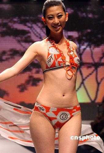 7月11日晚,著名内衣品牌在北京推出2009专场发布会,以“浪漫假日”、“动感节奏”和“异域风情”不同设计主题进行创意诠释,使泳衣的时装化风潮超越有限的T台空间。设计师创作以“水之约”为灵感, 81套泳装设计打破传统常规的泳衣设计理念,运用高级成衣、礼服的典型视觉元素与奢美制作工艺,尽展泳衣的别样风情。中新社发 钱兴强 摄