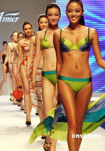 7月11日晚,著名内衣品牌在北京推出2009专场发布会,以“浪漫假日”、“动感节奏”和“异域风情”不同设计主题进行创意诠释,使泳衣的时装化风潮超越有限的T台空间。设计师创作以“水之约”为灵感, 81套泳装设计打破传统常规的泳衣设计理念,运用高级成衣、礼服的典型视觉元素与奢美制作工艺,尽展泳衣的别样风情。中新社发 钱兴强 摄