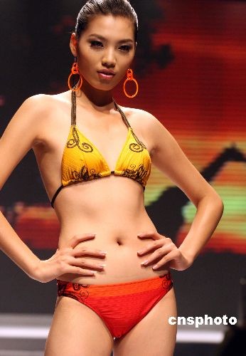 7月11日晚,著名内衣品牌在北京推出2009专场发布会,以“浪漫假日”、“动感节奏”和“异域风情”不同设计主题进行创意诠释,使泳衣的时装化风潮超越有限的T台空间。设计师创作以“水之约”为灵感, 81套泳装设计打破传统常规的泳衣设计理念,运用高级成衣、礼服的典型视觉元素与奢美制作工艺,尽展泳衣的别样风情。中新社发 钱兴强 摄