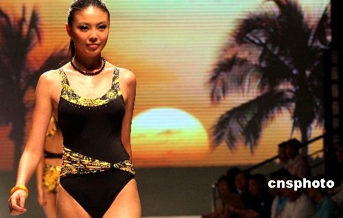 7月11日晚,著名内衣品牌在北京推出2009专场发布会,以“浪漫假日”、“动感节奏”和“异域风情”不同设计主题进行创意诠释,使泳衣的时装化风潮超越有限的T台空间。设计师创作以“水之约”为灵感, 81套泳装设计打破传统常规的泳衣设计理念,运用高级成衣、礼服的典型视觉元素与奢美制作工艺,尽展泳衣的别样风情。中新社发 钱兴强 摄