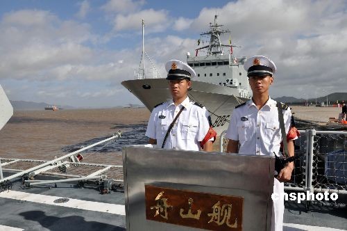 7月15日,中国海军第三批护航编队誓师动员大会在浙江舟山某部隆重举行。经中央军委批准,中国海军第三批护航编队将于7月16日从浙江舟山某军港启程,赴亚丁湾索马里海域接替第二批护航编队遂行任务。即将出征的第三批护航编队由东海舰队的 “舟山”号导弹护卫舰、“徐州”号导弹护卫舰和“千岛湖”号综合补给舰,两架舰载直升机以及海军特战队员组成。中新社发 阿胡 摄