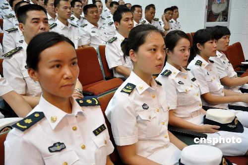 7月15日,中国海军第三批护航编队誓师动员大会在浙江舟山某部隆重举行。经中央军委批准,中国海军第三批护航编队将于7月16日从浙江舟山某军港启程,赴亚丁湾索马里海域接替第二批护航编队遂行任务。即将出征的第三批护航编队由东海舰队的 “舟山”号导弹护卫舰、“徐州”号导弹护卫舰和“千岛湖”号综合补给舰,两架舰载直升机以及海军特战队员组成。中新社发 阿胡 摄