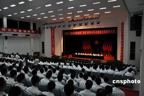 7月15日,中国海军第三批护航编队誓师动员大会在浙江舟山某部隆重举行。经中央军委批准,中国海军第三批护航编队将于7月16日从浙江舟山某军港启程,赴亚丁湾索马里海域接替第二批护航编队遂行任务。即将出征的第三批护航编队由东海舰队的 “舟山”号导弹护卫舰、“徐州”号导弹护卫舰和“千岛湖”号综合补给舰,两架舰载直升机以及海军特战队员组成。中新社发 阿胡 摄