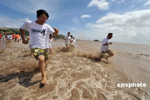 浙江省全民健身浙东片区“种文化”海洋体育活动7月14日在岱山鹿栏晴沙景区上演,来自省内7个地市56个单位的700多名选手在鹿栏晴沙景区参加海洋特色体育项目沙滩运动会,主要项目包括海滩套缆绳、海滩爬船绳、沙滩障碍接力、沙滩迎“新娘”、海上拔河等。中新社发 龙父 摄